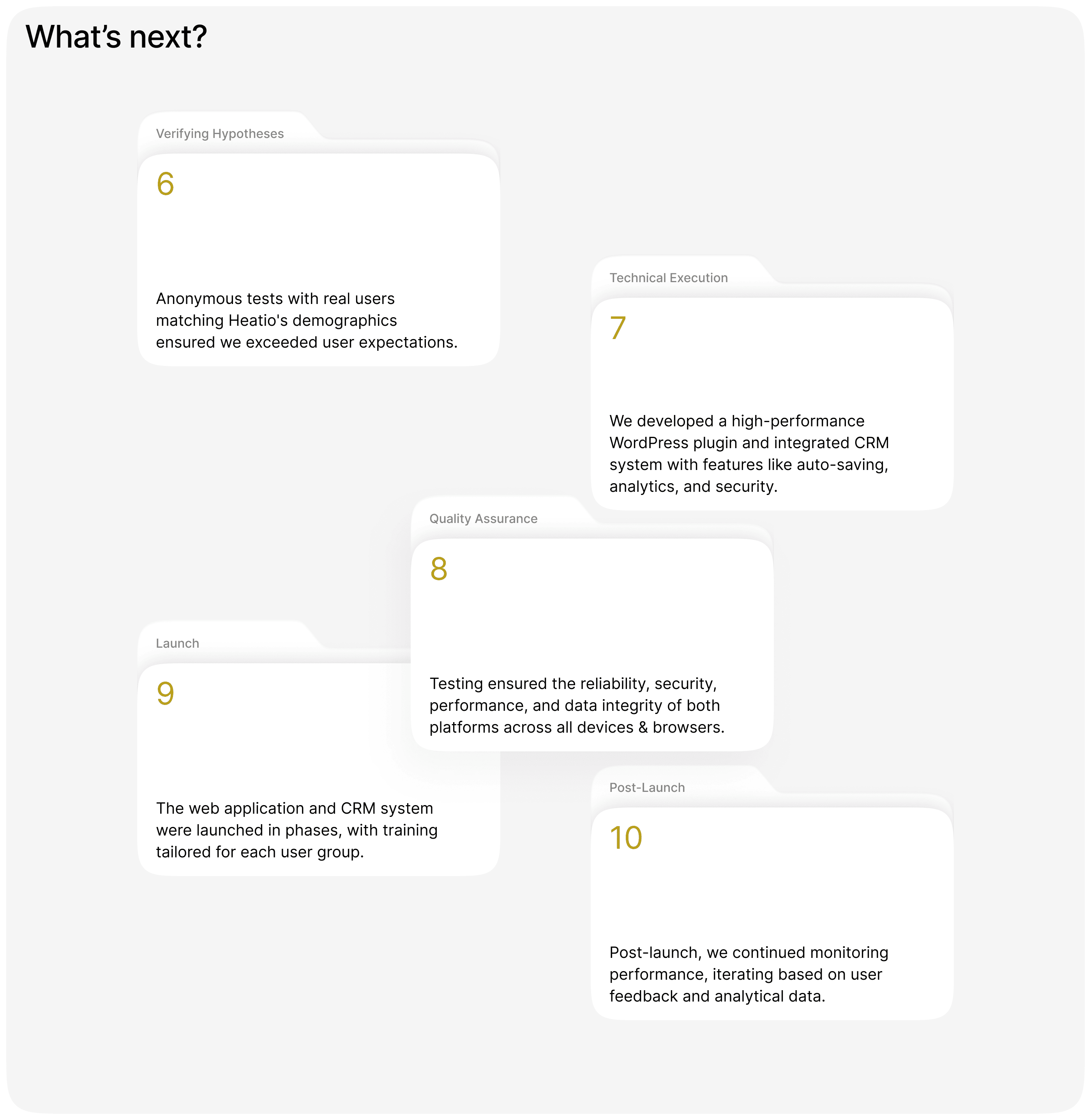 The deployment of the multi-step web application and CRM system marked a significant transformation in the client's digital presence and operational efficiency.